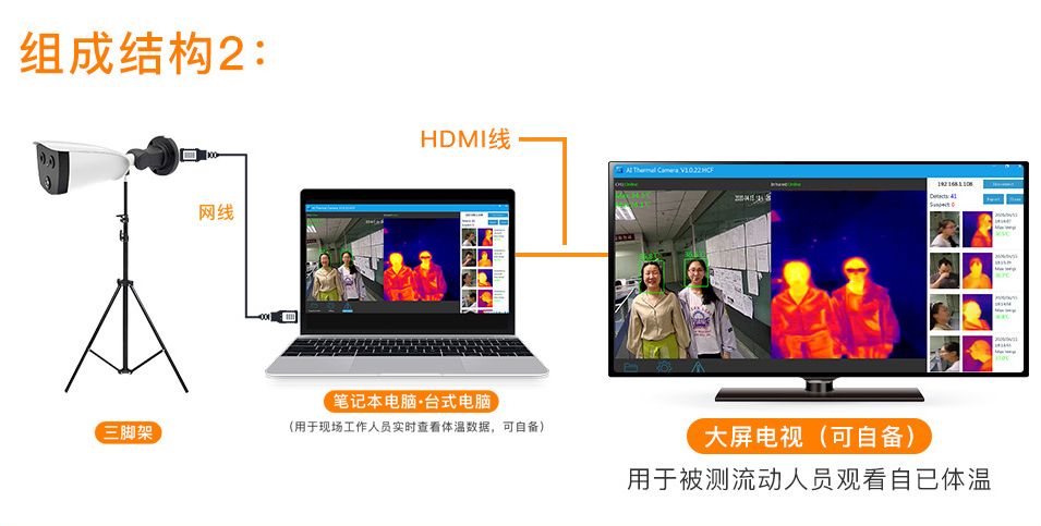 人體測溫攝像機,適用于醫院、學校、公安、政府、企業園區、機場、火車站、客運站、地鐵站等安檢入口臨時布控需要人體測溫篩查的場所。除了根據實際情況選配攝像機之外,還需要三腳架+客戶端才能夠完成熱成像人體測溫的檢測。